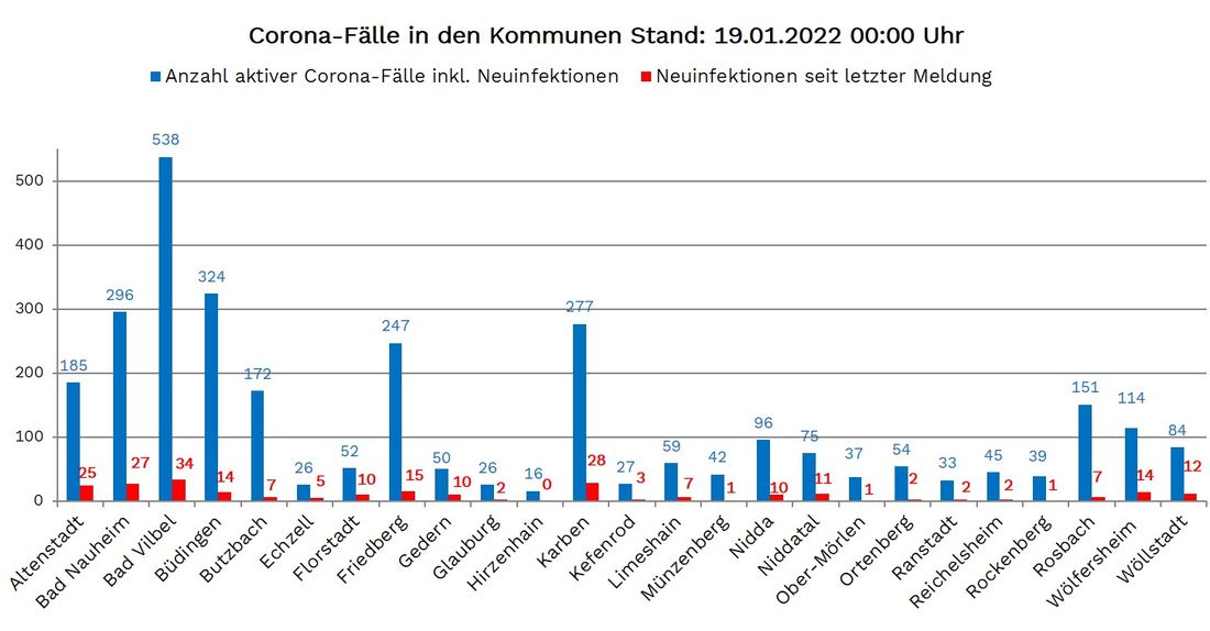 Neuinfektionen wurden aus 24 der 25 Wetterauer Kommunen gemeldet: Altenstadt 25, Bad Nauheim 27, Bad Vilbel 34, Büdingen 14, Butzbach 7, Echzell 5, Florstadt 10, Friedberg 15, Gedern 10, Glauburg 2, Karben 28, Kefenrod 3, Limeshain 7, Münzenberg 1, Nidda 10, Niddatal 11, Ober Mörlen 1, Ortenberg 2, Ranstadt 2, Reichelsheim 2, Rockenberg 1, Rosbach 7, Wölfersheim 14 und Wöllstadt 12.