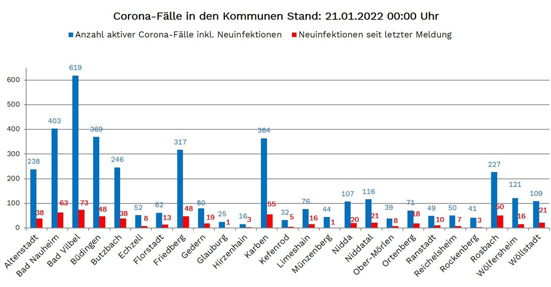 Neuinfektionen wurden aus allen 25 Wetterauer Kommunen gemeldet: Altenstadt 38 und Bad Nauheim 63, Bad Vilbel 73, Büdingen 48, Butzbach 38, Echzell 8, Florstadt 13, Friedberg 48, Gedern 19, Glauburg 1, Hirzenhain 3, Karben 55, Kefenrod 5, Limeshain 16, Münzenberg 1, Nidda 20, Niddatal 21, Ober Mörlen 8, Ortenberg 18, Ranstadt 10, Reichelsheim 7, Rockenberg 3, Rosbach 50, Wölfersheim 16, Wöllstadt 21.