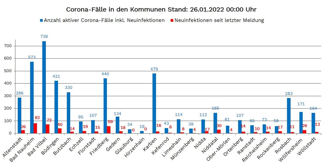 Neuinfektionen wurden aus 23 der 25 Wetterauer Kommunen gemeldet: Altenstadt 26 und Bad Nauheim 82, Bad Vilbel 72, Büdingen 40, Butzbach 14, Echzell 19, Florstadt 15, Friedberg 59, Gedern 18, Karben 16, Kefenrod 6, Limeshain 8, Münzenberg 4, Nidda 17, Niddatal 30, Ober Mörlen 4, Ortenberg 14, Ranstadt 10, Reichelsheim 14, Rockenberg 17, Rosbach 11, Wölfersheim 26 und Wöllstadt 13.