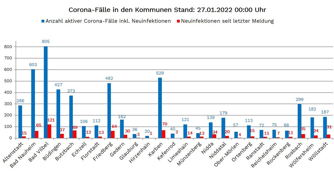 Neuinfektionen wurden aus allen 25 Wetterauer Kommunen gemeldet: Altenstadt 15, Bad Nauheim 65, Bad Vilbel 121, Büdingen 37, Butzbach 69, Echzell 12, Florstadt 13, Friedberg 64, Gedern 30, Glauburg 3, Hirzenhain 1, Karben 70, Kefenrod 2, Limeshain 14, Münzenberg 13, Nidda 34, Niddatal 20, Ober Mörlen 4, Ortenberg 15, Ranstadt 11, Reichelsheim 7, Rockenberg 11, Rosbach 35, Wölfersheim 24, Wöllstadt 31.