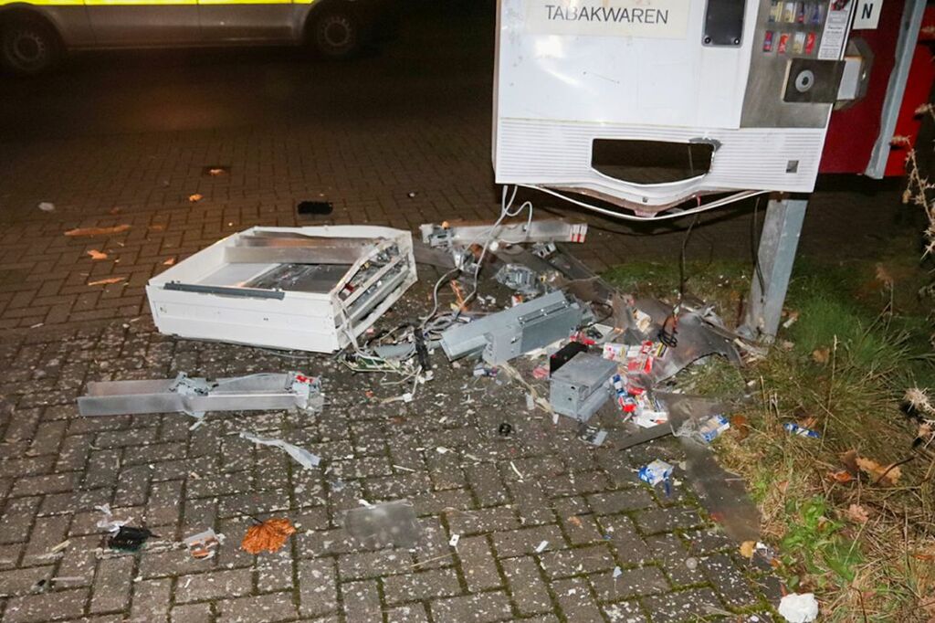 Nach derzeitigen Erkenntnissen haben die Täter den Automaten mit einem Böller osteuropäischer Herkunft gesprengt. Durch umherfliegende Trümmerteile wurde ein geparktes Fahrzeug beschädigt. Ein Zeuge beobachtete offenbar die Explosion und sah zwei Männer, die zunächst das Geld sowie Zigaretten einsammelten. Anschließend flüchteten Sie mit einer dunklen Limousine, vermutlich mit
