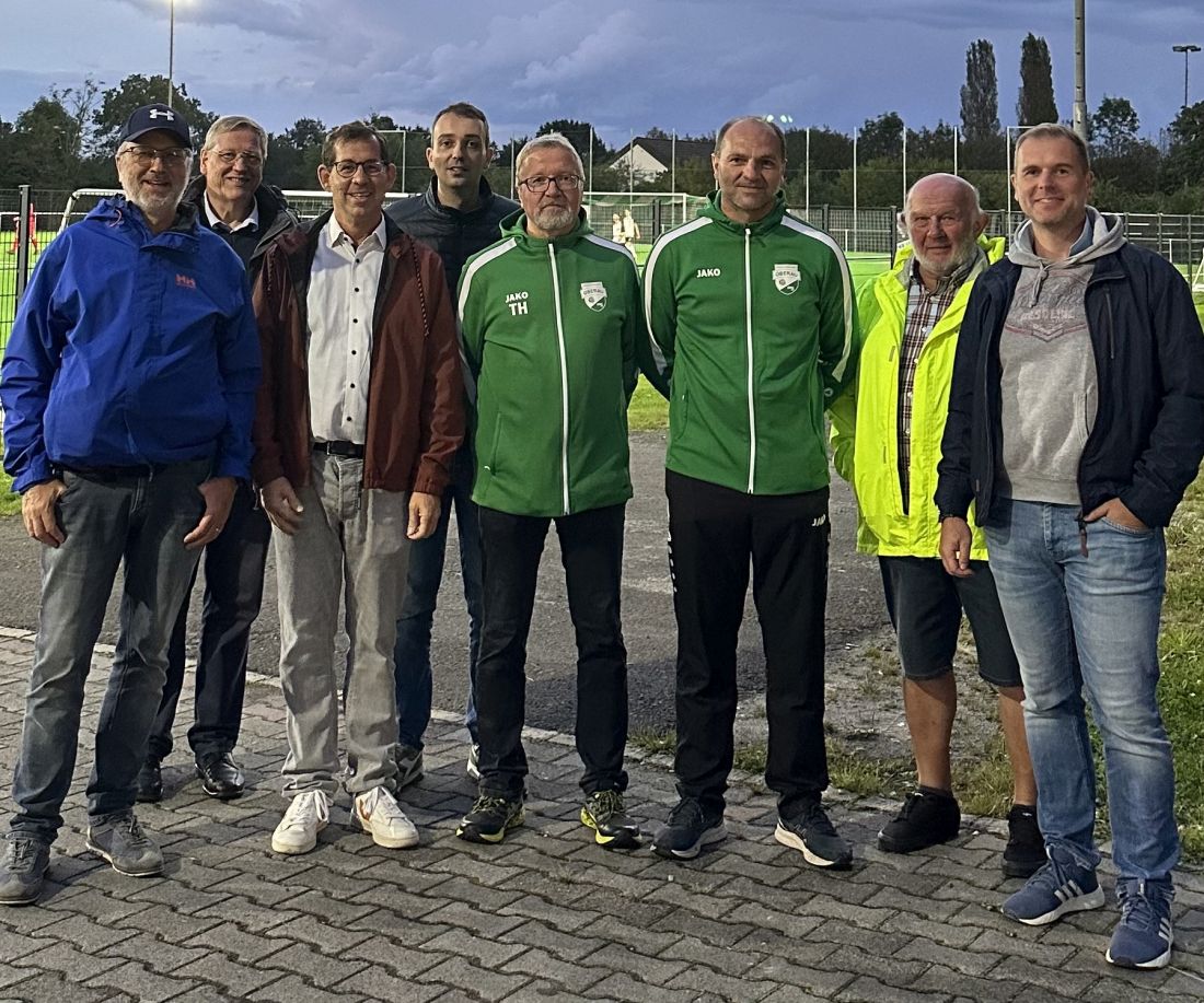 Bild: CDU-Sommerradtour auf dem Sportgelände der Sportfreunde Oberau mit Sebastian Miano, stellv. Ortsvorsteher (1. von rechts), Sven Müller-Winter, Fraktionsvorsitzender (3. von rechts), Thomas Haas, Vorsitzender der Sportfreunde Oberau (5. von rechts), Alexander Sommerfeld, Jugendleiter (3. von links) und Christian Keim, Vorsitzender der Gemeindevertretung (1. von links)