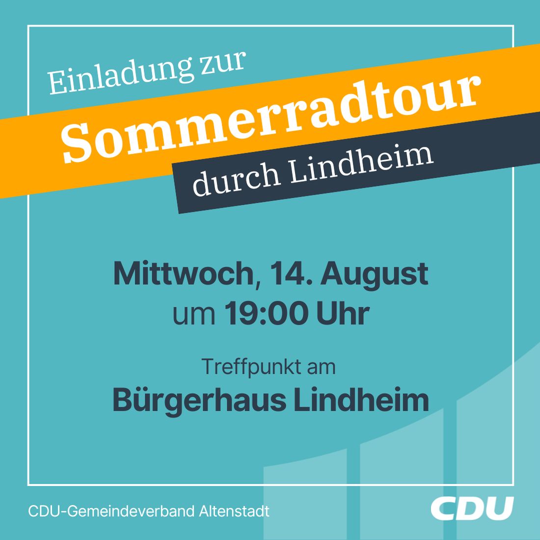 Der CDU-Gemeindeverband Altenstadt lädt zur dritten Station ihrer diesjährigen Sommertour ein. Am Mittwoch, 14. August, führt die ca. 1,5stündige Radspazierfahrt durch die Ortsteile Lindheim und Enzheim. Treffpunkt ist um 19 Uhr am Bürgerhaus in Lindheim.