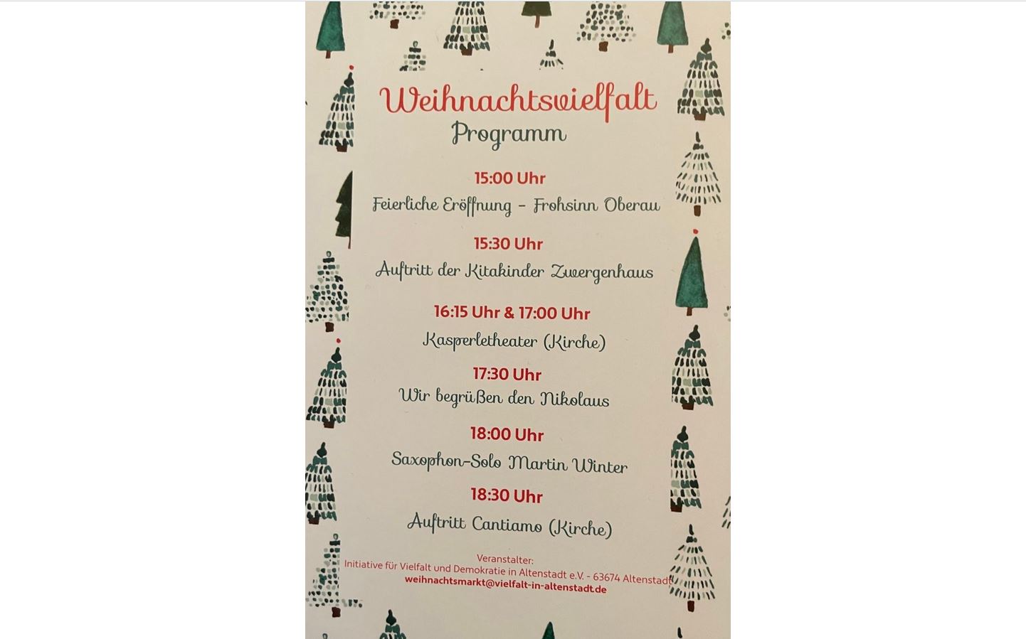 Die „Initiative für Vielfalt und Demokratie in Altenstadt e.V.“ und die evangelische Martin-Luther-Gemeinde laden nun schon zum 4. Mal zur „Weihnachtsvielfalt - dem besonderen Weihnachtsmarkt in der Waldsiedlung“ ein.