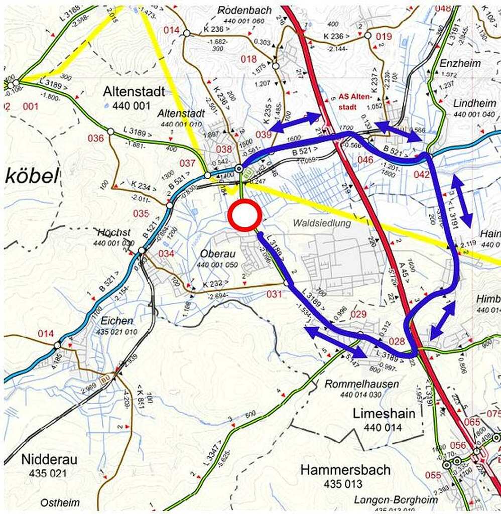 Für die Verkehrsteilnehmenden wird daher eine Umleitungsstrecke eingerichtet und ausgeschildert. Diese führt ab Altenstadt über die B 521 bis zum Lindheimer Kreuz, dort auf der L 3191 über Hainchen bis zum Kreuzungsbereich bei Himbach und von dort schließlich auf der L 3189 über Rommelhausen in Richtung Oberau bzw. Waldsiedlung. Die Umleitung für die entgegensetzte Fahrtrichtung wird analog geführt. Zusätzlich wird an der A