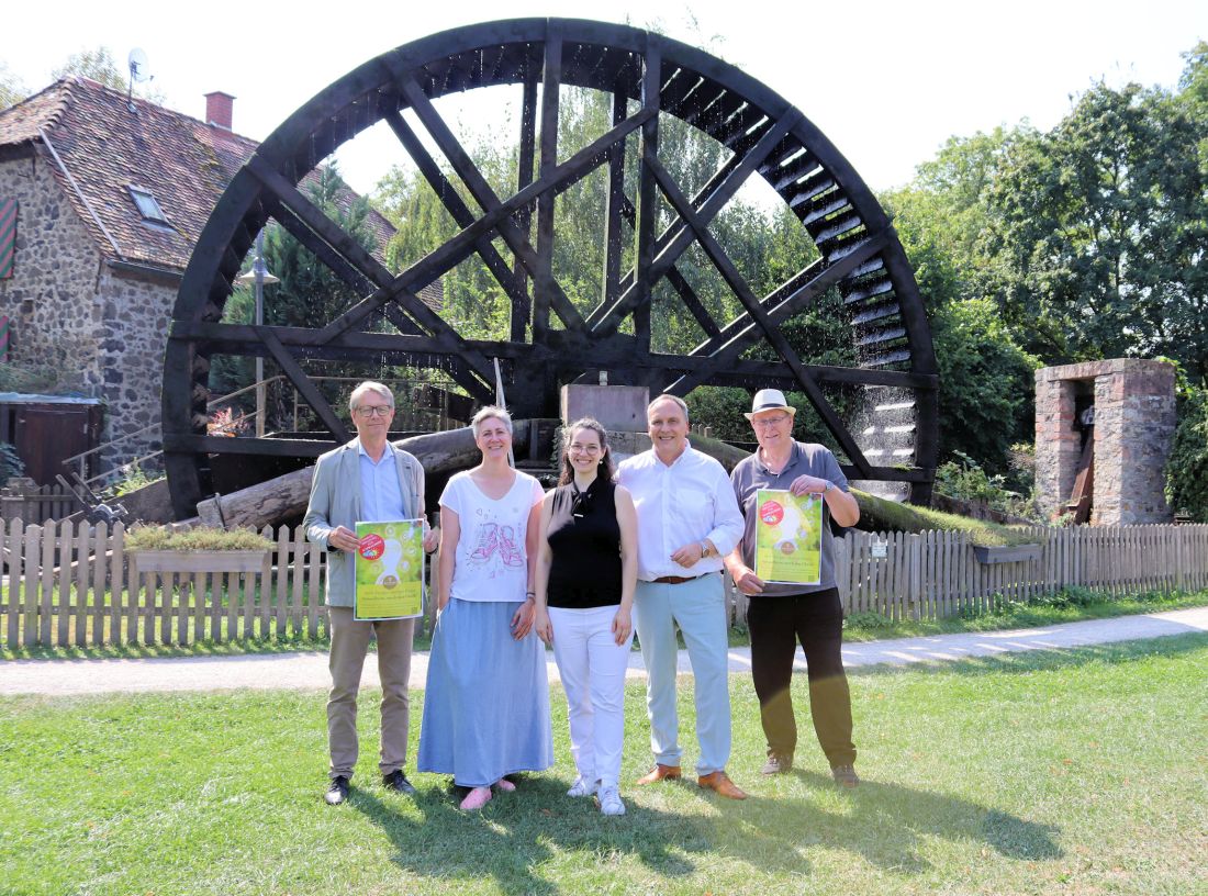BU: Sie freuen sich auf das Energieberatungsangebot in Schwalheim: Dezernent Dr. Martin Düvel, Ortsvorsteherin Lisa Graudenz, städtische Klimaschutzmanagerin Anea Lang, Bürgermeister Klaus Kreß und Ortsbeiratsmitglied Dieter Hahn (v.l.n.r.) am Schwalheimer Rad, ein beeindruckendes Symbol zur Energieerzeugung. Immerhin ist es mit seinem Durchmesser von 9,80 Meter eines der größten Wasserräder Europas und diente zu Zeiten der örtlichen Salzproduktion als Antrieb des Pumpwerks, welches Sole auf die Gradierwerke der Bad Nauheimer Saline beförderte.