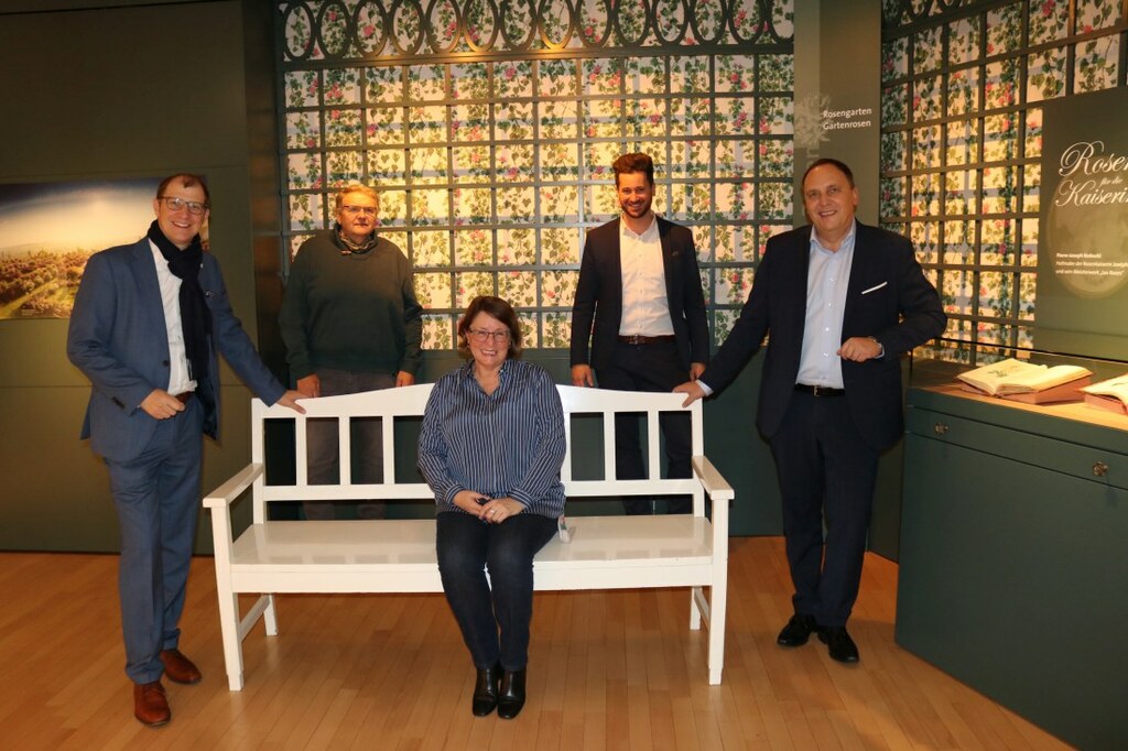 Foto: Rosige Zeiten heißt die Dauerausstellung, die im Rosenmuseum in Steinfurth zu sehen ist. Unser Bild zeigt von links: Landrat Jan Weckler, Heinz Thönges (Stadtrat Bad Nauheim und Dezernent für das Rosenmuseum), Dr. Jutta Pauli (Museumsleiterin), Matthias Wieliki (Fachbereichsleiter Zentrale Steuerung der Stadt Bad Nauheim) und Bad Nauheims Bürgermeister Klaus Kreß.