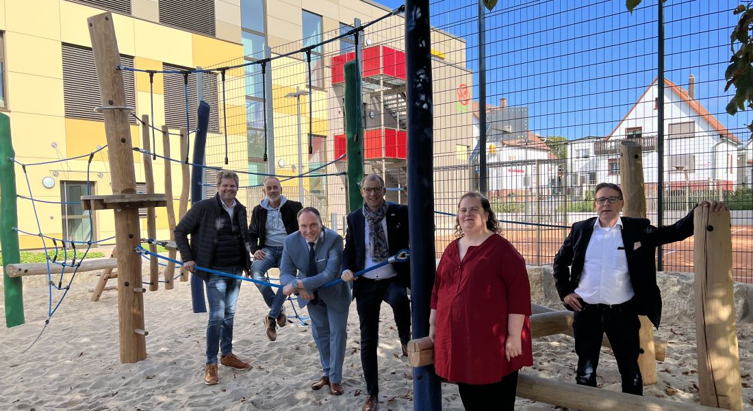 Bildunterschrift: Freuen sich über die neue Sportanlage an der Rosendorfschule (von rechts): Ortsvorsteher Markus Philippi, Schulleiterin Silke Lahr, Landrat Jan Weckler und Bürgermeister Klaus Kress mit Mitarbeitern der Stadt.