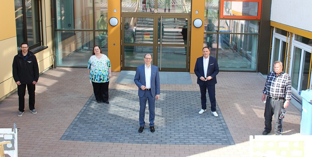Foto: Landrat Jan Weckler (Mitte) und Bürgermeister Klaus Kreß (hinten rechts) besichtigt den fertiggestellten Anbau an der Rosendorfschule in Steinfurth gemeinsam mit Schulleiterin Silke Lahr, Hausmeister Helmuth Falk und Projektleiter des Fachdienstes Hochbau des Wetteraukreises, Normen Preuß.