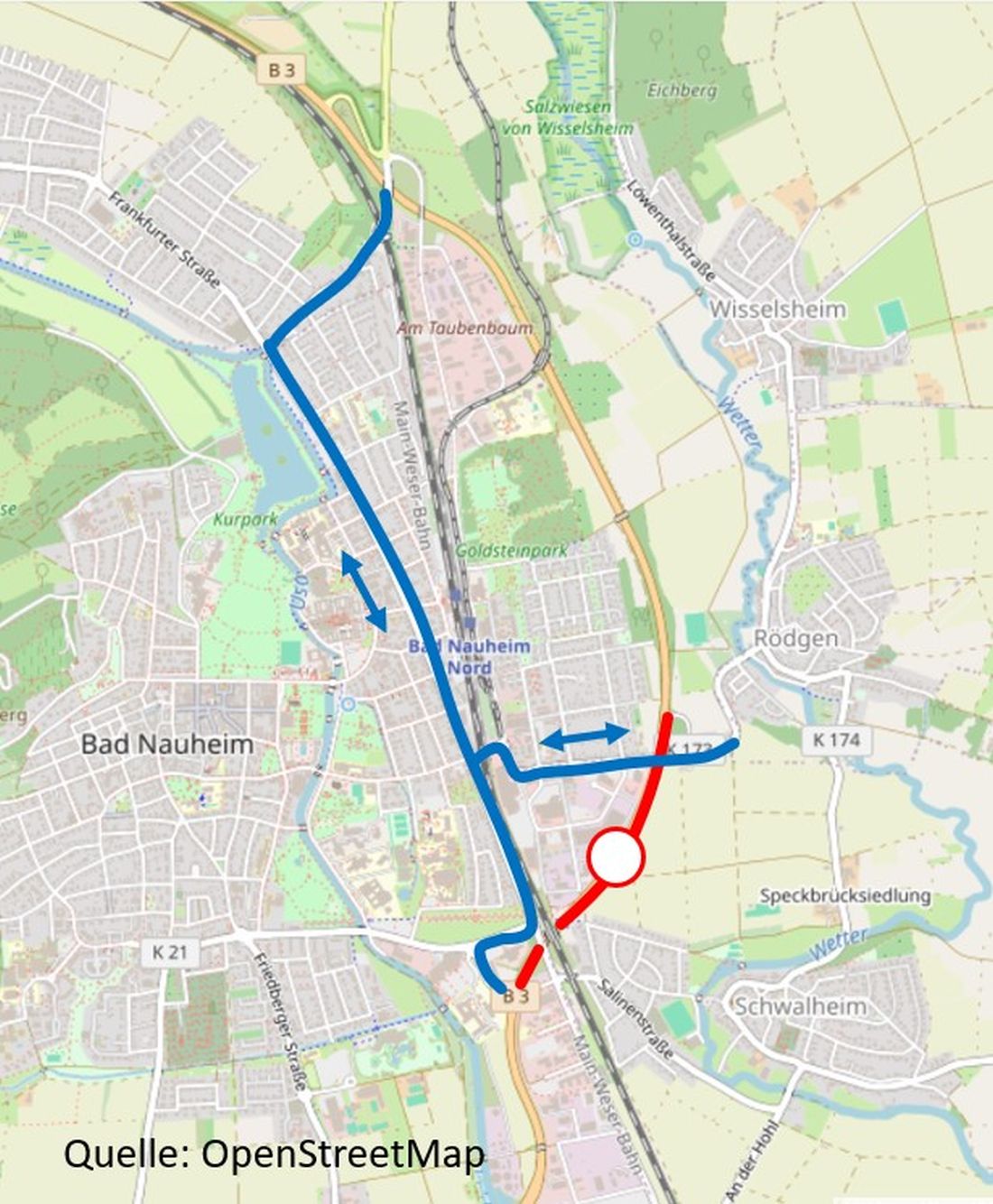 Hessen Mobil repariert punktuelle Fahrbahnschäden an der Bundesstraße 3 bei Bad Nauheim im Bereich zwischen der Schwalheimer Straße und der Abfahrt nach Rödgen zur K 174. Während der Bauarbeiten muss die B 3 vom 14. Juli bis 17. Juli 2025 voll gesperrt werden. Die Arbeiten können im Rahmen einer Nachtbaustelle in der Zeit jeweils von 20 bis 6 Uhr durchgeführt werden. Eine Umleitung ist währenddessen eingerichtet und vor Ort ausgeschildert.