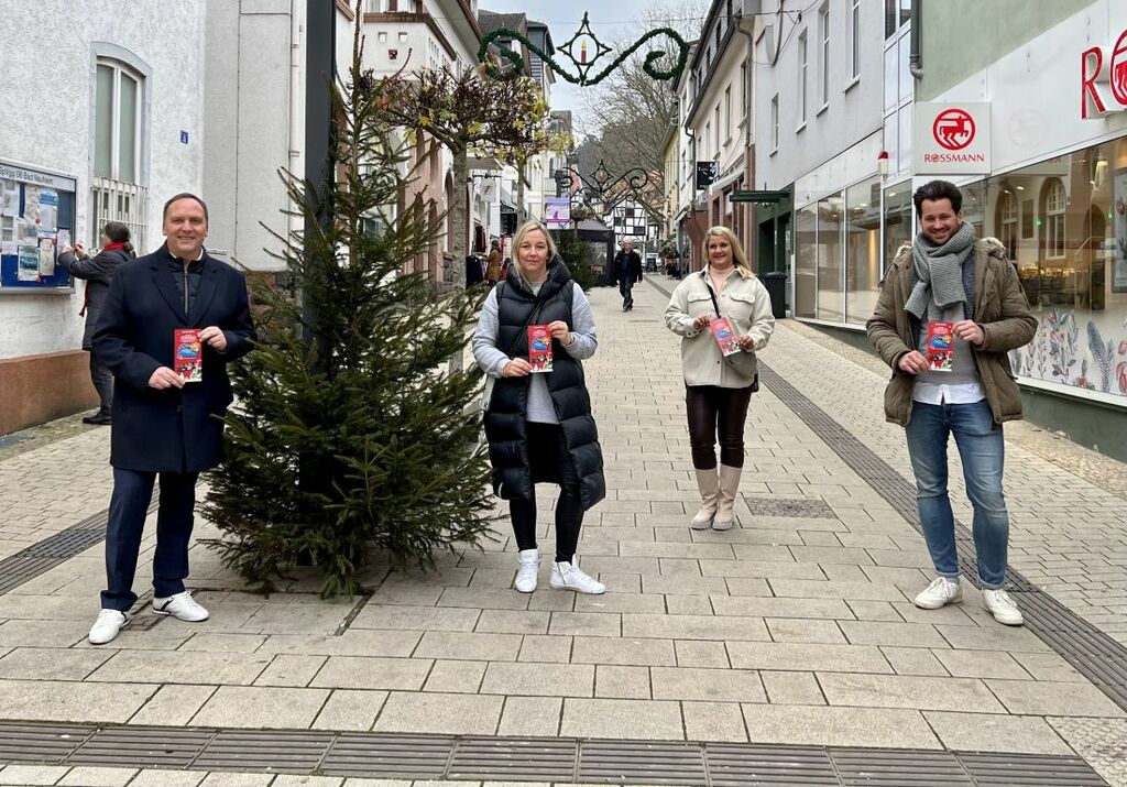Foto: Bürgermeister Klaus Kreß, Natascha Schmidt (Vorsitzende Erlebnis Bad Nauheim e.V., Claudia Horlacher (Inhaberin Lucky Man&Woman) und Matthias Wieliki, Fachbereichsleiter Zentrale Steuerung und Öffentlichkeitsarbeit sind von dem Sprudeltaler-Konzept überzeugt.[v.l.n.r.]