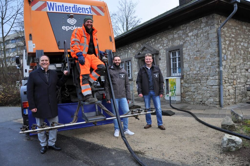 Foto: Die Kurstadt ist gerüstet für den Winterdienst: Die Stadt Bad Nauheim hat zudem in diesem Jahr die Abgabemenge der Sole für Hessen Mobil und Friedberg erhöht. Die eigenen Winterdienstfahrzeuge nutzen die Sole schon seit 2010. Von links: Bürgermeister Klaus, Landschaftsgärtner Sascha Panz, Johannes Herold (Fachdienstleiter Stadtbildpflege) und Volkmar Dörn (Fachdienstleiter Kureinrichtungen und Therme).
