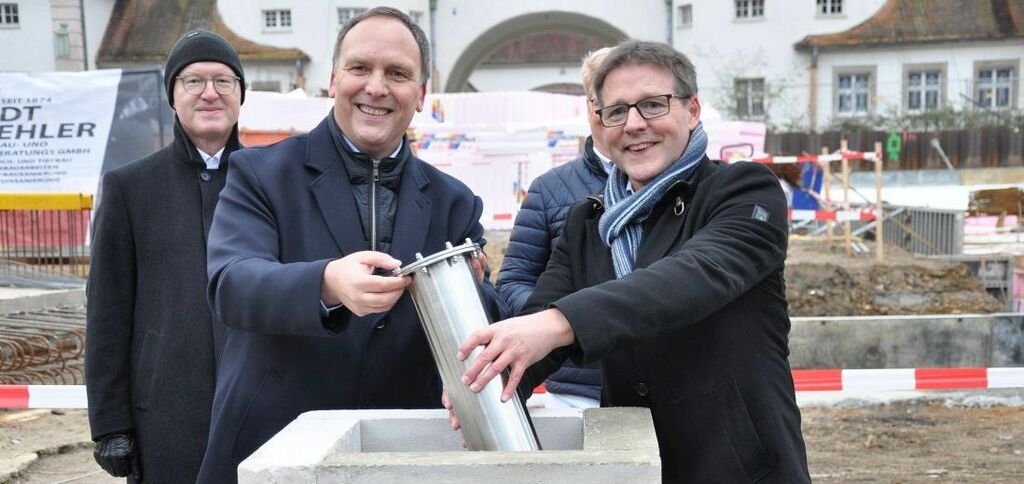 Foto: Die Edelstahlkapsel für die Grundsteinlegung der neuen Sprudelhof Therme liegt auf der Mauer bereit.