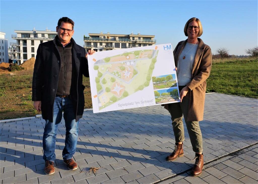 Foto: Erster Stadtrat Sebastian Wysocki und Simone Michel vom Landschaftsarchitektenbüro waren mit dem Plan für den neuen Spielpark an Ort und Stelle.