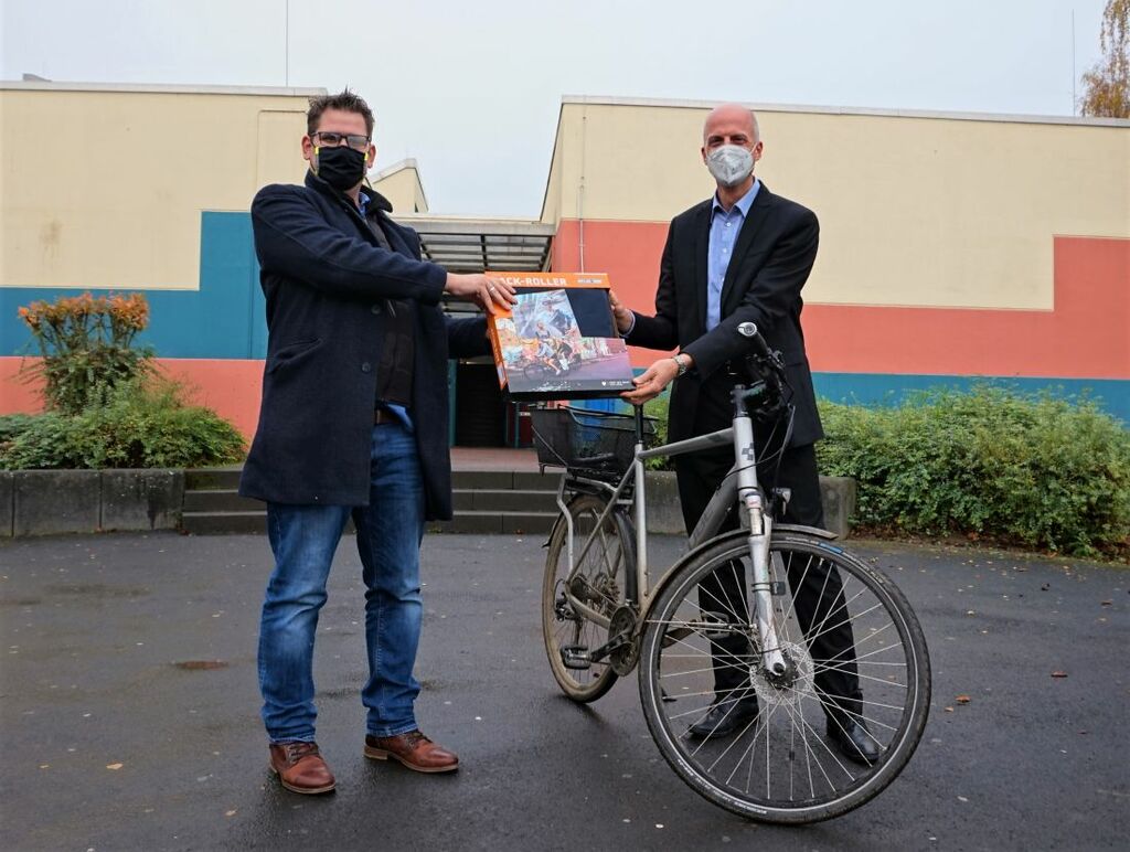 Foto: Erster Stadtrat Sebastian Wysocki überreicht dem Schulleiter des Georg-Büchner-Gymnasiums und Stadtradelstar, Carsten Treber, das Stadtradelgeschenk 2020.