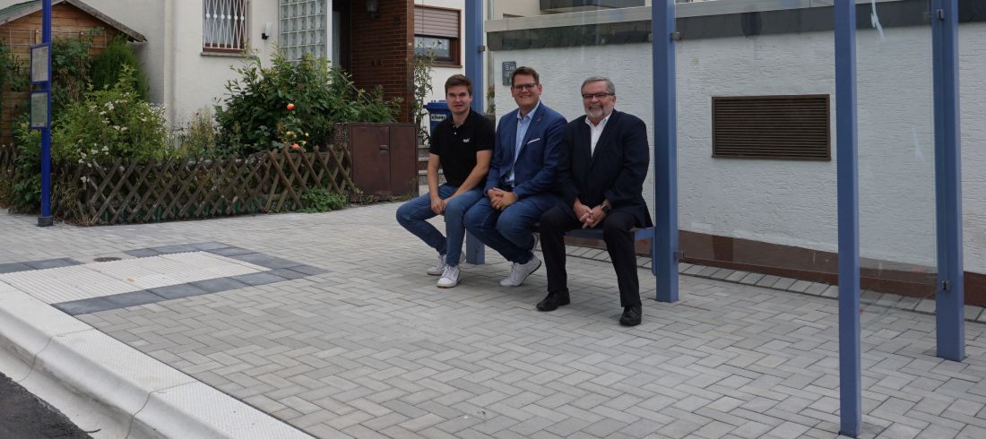 Bildunterschrift: Bürgermeister Sebastian Wysocki mit Ortsvorsteher Karl Peter Schäfer und dessen Stellvertreter Janis Ahäuser in der umgebauten Bushaltestelle am Nidderring.