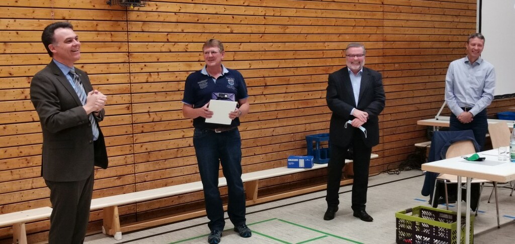 Nun konnte man unter Einhaltung aller Abstands- und Hygienevorgaben die Versammlung abhalten. Bürgermeister Dr. Thomas Stöhr ließ es sich nicht nehmen, an der Versammlung teilzunehmen und kam mit vollen Händen. Der Verein erhielt einen städtischen Zuschussbescheid und Rigo Umlauf, zweiter Vorsitzender des SV Gronau, wurde mit der silbernen Ehrennadel der Stadt Bad Vilbel ausgezeichnet.