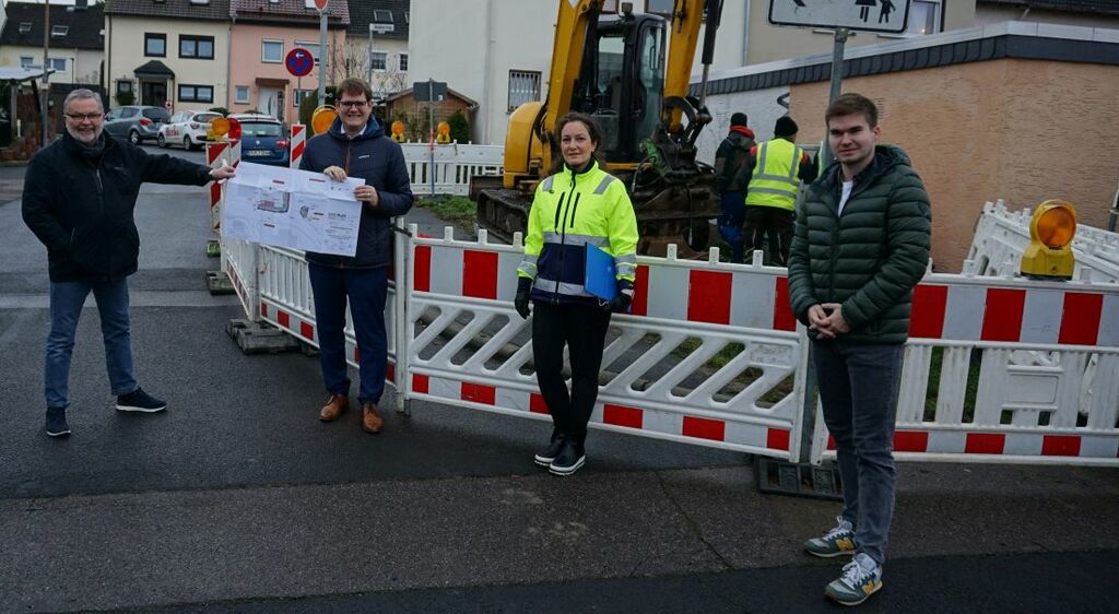 Foto: Ortsvorsteher Karl Peter Schäfer, Erster Stadtrat Sebastian Wysocki, Derya Öcal vom Fachdienst Infrastruktur Kanal und Straße sowie der stellvertretende Ortsvorsteher Gronaus, Jannis Ahäuser, beim Beginn des barrierefreien Ausbaus der Bushaltestelle Nidderring.