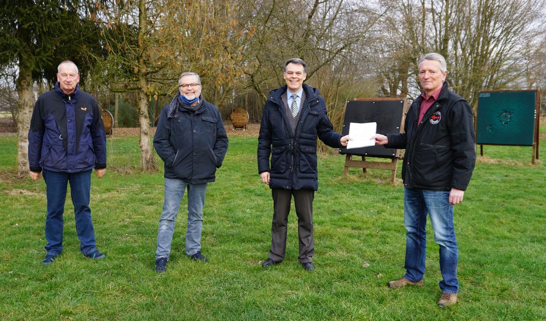 Foto: Im Beisein des Pressewartes des BSC Gronau, Matthias Beller, und von Ortsvorsteher Karl Peter Schäfer überreichte Bürgermeister Dr. Thomas Stöhr dem Vereinsvorsitzenden, Michael Knapp, den Zuschussbescheid der Stadt Bad Vilbel.
