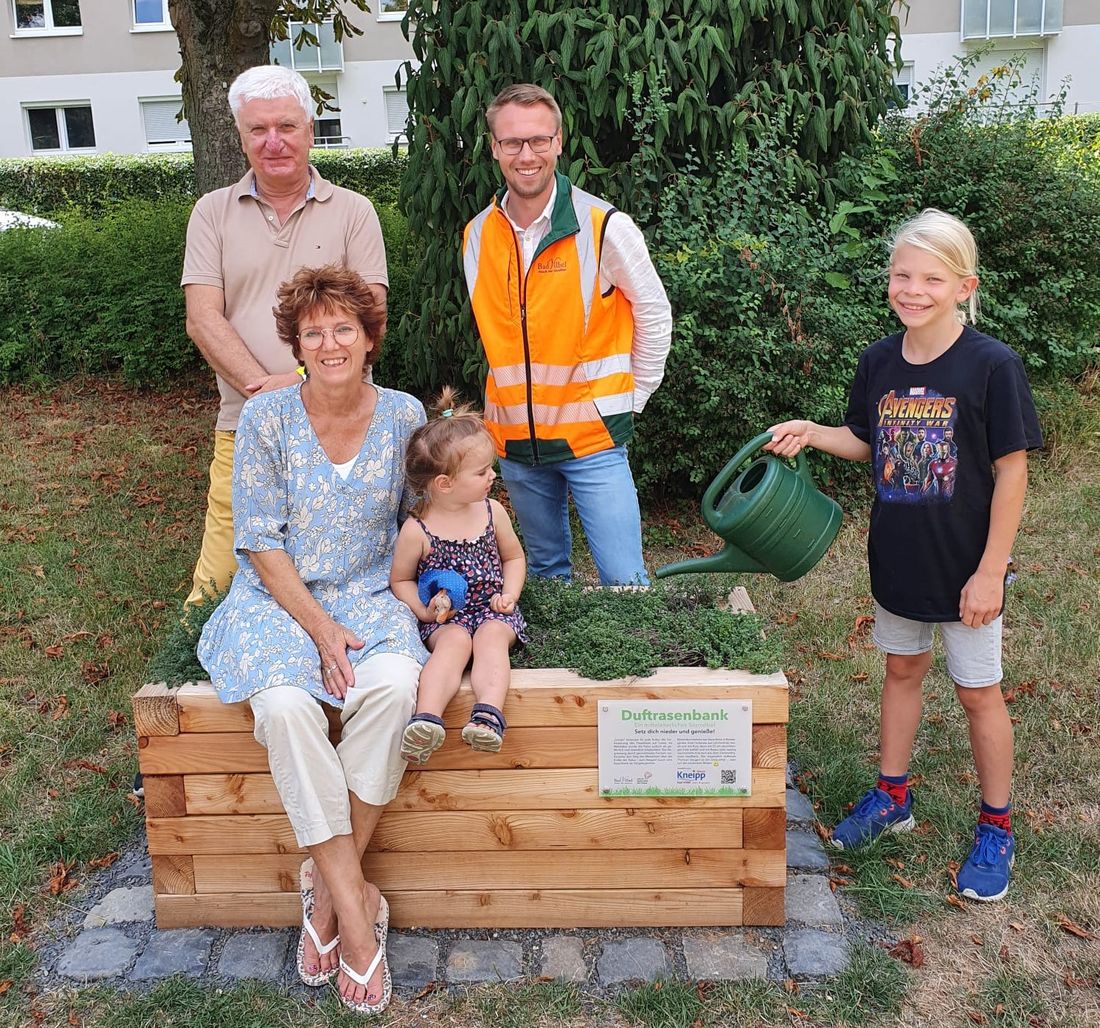 Ortsvorsteher Heilsberg Peter Schenk, Grünflächenbereichsleiter Alexander Kasimir, Duftrasenbank Pate und Pflanzengießer Emil Schieber sowie Linda Pfeiffer Pressewartin Kneipp Verein und ihre Enkelin Lara befinden die Duftrasenbank im Freudenbergpark für gut.