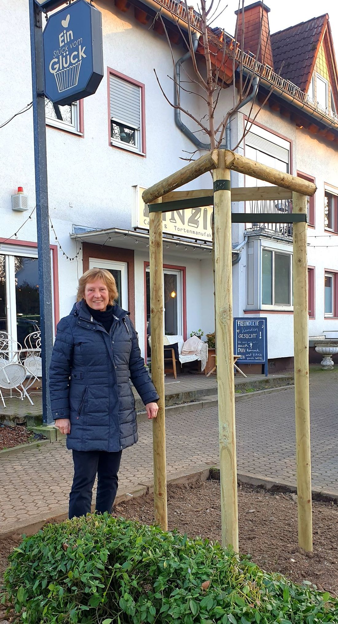 Petra Schärpf, Ortsbeiratsmitglied Heilsberg an einem der nachgepflanzten Bäume auf der Alten Frankfurter Straße.