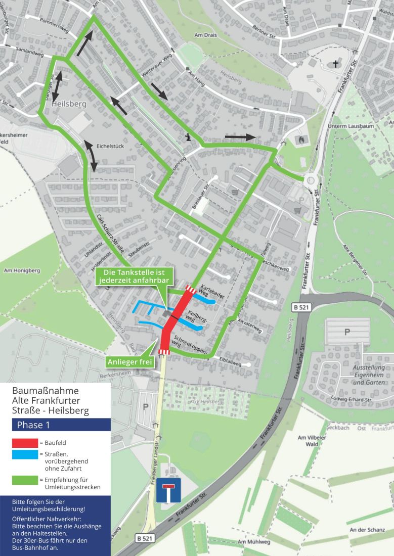 Der Vilbus Linie 60 fährt im ersten Bauabschnitt so wie bisher und hält zusätzlich an der Ersatzhaltestelle „Alte Frankfurter Straße", die für die Gelenkbusse der Linie 30 zwischen Kreisverkehr Heilsberg und der katholischen Kirche Verklärung Christi eingerichtet wird. Die Buslinien X97, n96 und 551 halten nur noch an der Buswendeschleife „Alte Frankfurter Straße". Die Frankfurter Buslinie 30 hält nur noch an der Ersatzhaltestelle „Alte Frankfurter Straße" unterhalb vom Kreisverkehr.
