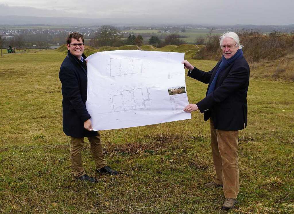 Foto: Noch stehen sie auf freiem Felde. Bald schon werden Erster Stadtrat Sebastian Wysocki und Sozialdezernent Dr. h.c. Jörg-Uwe Hahn die Realisierung des Plans erleben, den sie in der Hand halten.