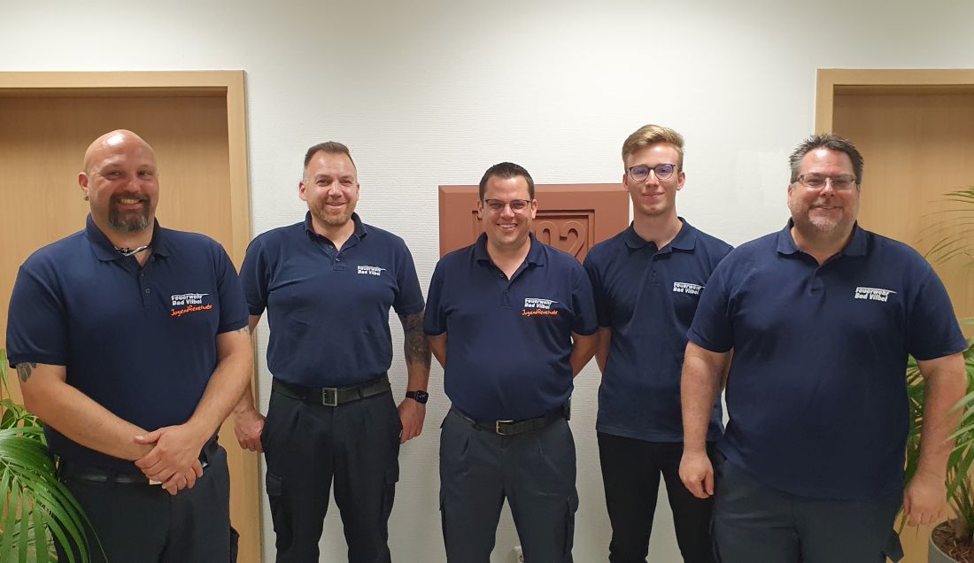 Foto: Stadtjugendfeuerwehrwart Stefan Schmidt, stellv. Wehrführer Andreas Weber, Jugendfeuerwehrwart Heiko Schneider, stellv. Jugendfeuerwehrwart Jonas Scholz, Wehrführer Thorsten Hering (v.l.n.r.). Copyright Feuerwehr Bad Vilbel