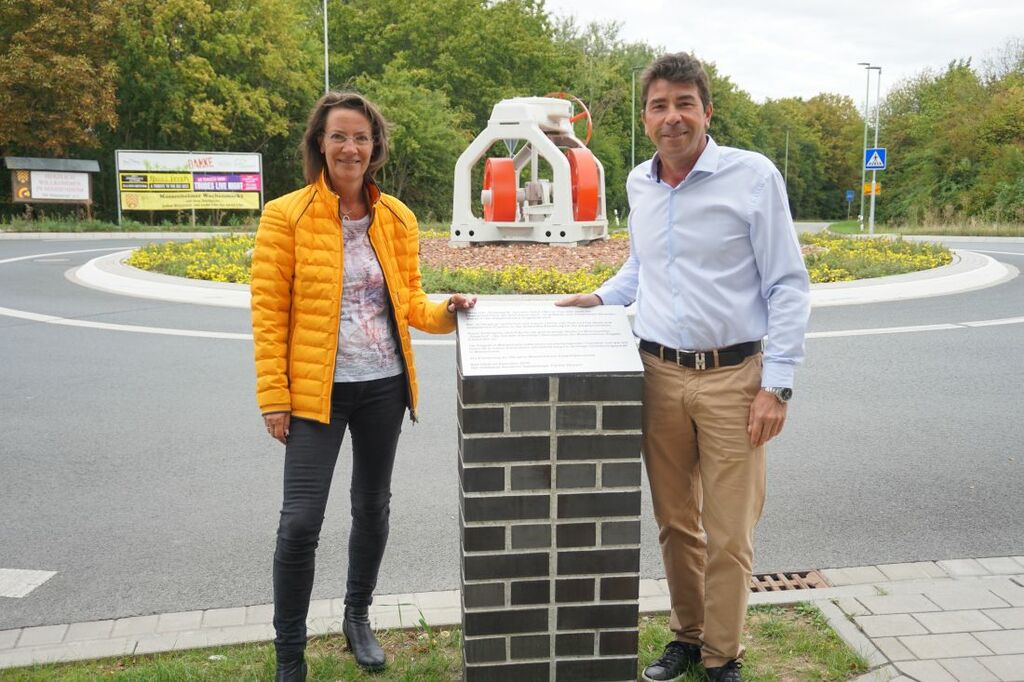 Die Ziegelei in Massenheim hatte einen standortprägenden Charakter und war mit ihrem 60 m hohen Schornstein Jahrzehnte lang ein wichtiger Orientierungspunkt in Massenheim,“ kann man jetzt auf einer Stele am Rande des Kreisels lesen. Utter bedankte sich bei Strauch, der nicht nur den Kollergang zur Verfügung gestellt hat, sondern auch die neue Tafel finanziert hat.