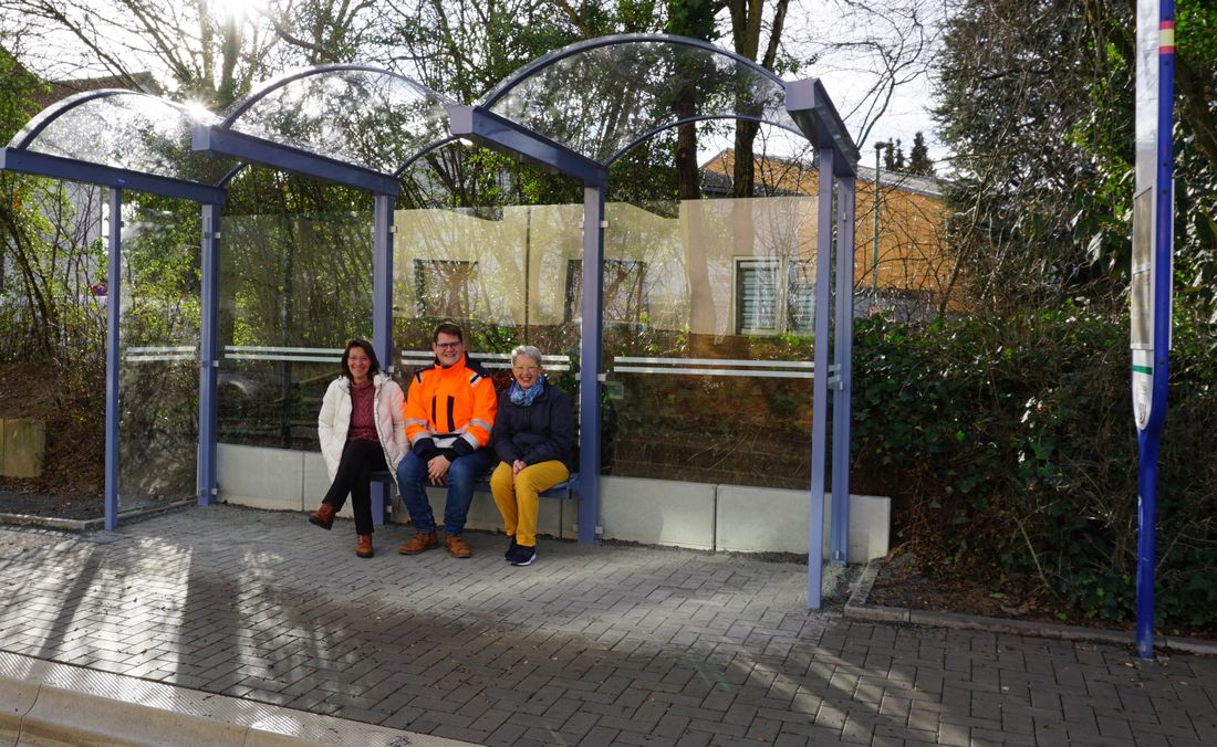Der Bürgermeister, Sebastian Wysocki, Massenheims Ortsvorsteherin Irene Utter und ihre Stellvertreterin, Annette Hielscher, freuen sich über die drei neuen barrierefreien Bushaltestellen in Massenheim.