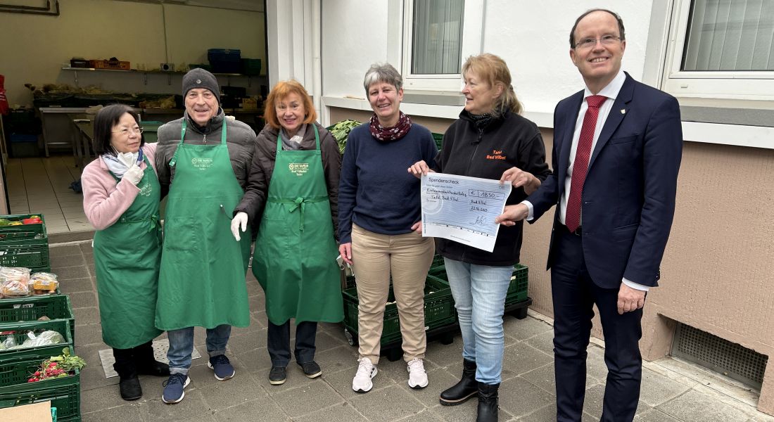Bildunterschrift: Claudia Marcks (dritte von rechts) und Tobias Utter (rechts) übergeben einen Scheck in Höhe von 1.850 Euro an das Team der Bad Vilbeler Tafel.