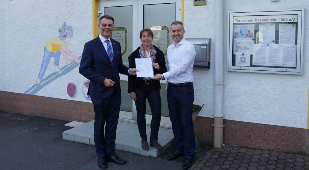 „Nachdem wir die Genehmigung für unseren Haushalt erhalten haben, konnten wir den Zuschussbescheid für den TV Massenheim nun übergeben. Damit kann der Verein die Sanierung seiner Sporthalle und Außenanlage angehen und somit die Zukunft seiner Angebote sichern. Wir freuen uns sehr, als Stadt unseren Teil hierzu beitragen zu können“, erklärte Bürgermeister Stöhr bei der Überreichung des Zuschussbescheids.