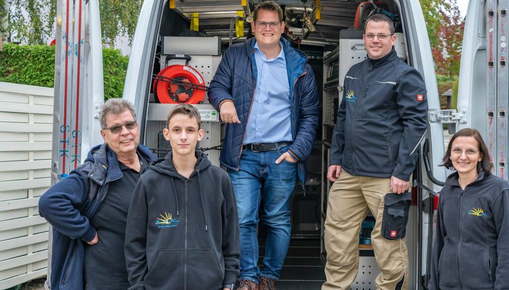 Foto: Klaus Kamer (links), Philipp Schneider, Bürgermeisterkandidat Sebastian Wysocki (Mitte), Heiko und Bettina Schneider vor dem Montagefahrzeug von STK.