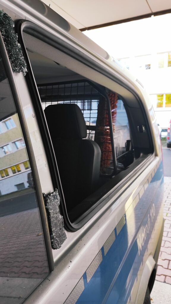 Nachdem die Beamten den offenbar unter Drogeneinfluss Stehenden in einen Streifenwagen gesetzt hatten, versuchte dieser, sich den Maßnahmen zu widersetzen. So gelang es ihm trotz angelegter Handfesseln, von Innen gegen eine Seitenscheibe zu treten, die vollständig herausbrach und auf der Fahrbahn landete.