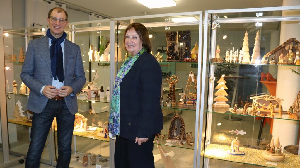 Foto: Landrat Jan Weckler und Erika Kernstock mit Exponaten aus der Ausstellung mit Weihnachtskrippen, die aktuell im Friedberger Kreishaus zu sehen ist.