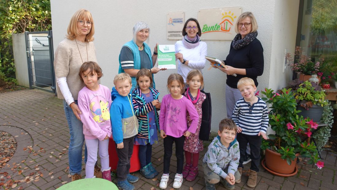 Für das Engagement zur Förderung früher Bildung im Bereich Mathematik, Informatik, Naturwissenschaft, Technik und nachhaltiger Entwicklung erhält die Kita Bunte 11 in Ossenheim die Zertifizierung von der Stiftung Kinder forschen. Überreicht wurde die Plakette von Annegret Jung, Mitarbeiterin des Netzwerkpartners Mathematikum Gießen, die eigens zur Verleihung die Kindertagesstätte in Friedberg-Ossenheim besuchte. Beworben hat sich die Kita Bunte 11 mit einem Pflanzen-Projekt, welches mit den Kindern im Kindergarten durchgeführt wurde. Die Kinder waren von der Aussaat über die Pflege der Pflanzen bis zur Verköstigung derselben stets involviert und engagiert und mit Freude bei der Sache.