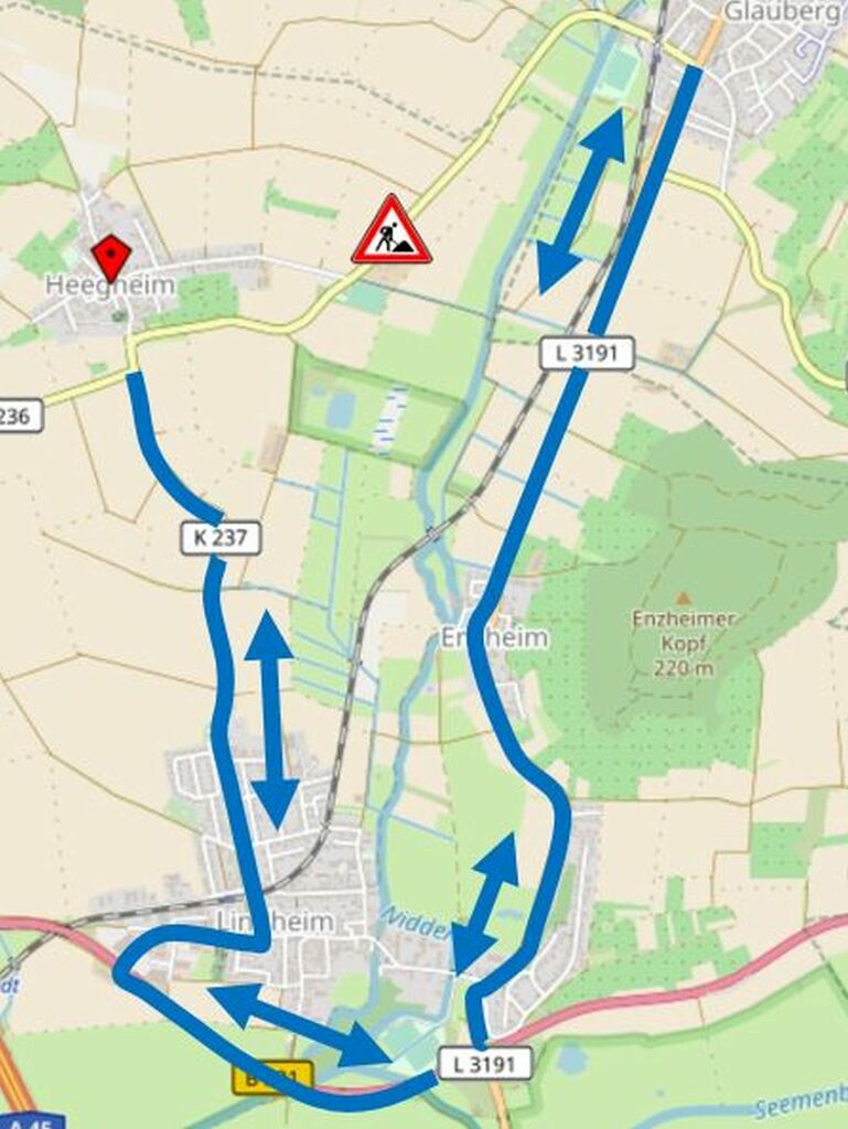 Diese führt für die Dauer der Arbeiten auf der L 3191 über Enzheim und Lindheim und anschließend auf der K 237 weiter nach Heegheim. Die Gegenrichtung erfolgt entsprechend. Da die Arbeiten nur unter dem Vorbehalt geeigneter Witterung durchgeführt werden können, kann eine Terminverschiebung nicht ausgeschlossen werden.