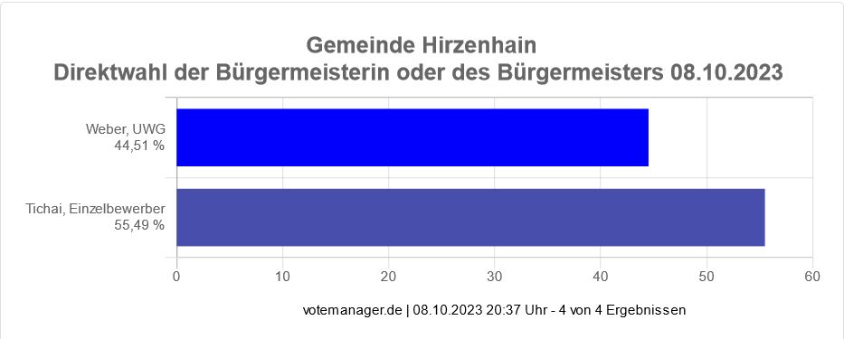 Timo Tichai bleibt Bürgermeister der Gemeinde Hirzenhain. Der parteilose Amtsinhaber kam bei der Wahl am 8. Oktober 2023 auf 55, Prozent und setzte sich damit gegen Marcel Weber (UWG) durch, der 44,51 Prozent erhielt.