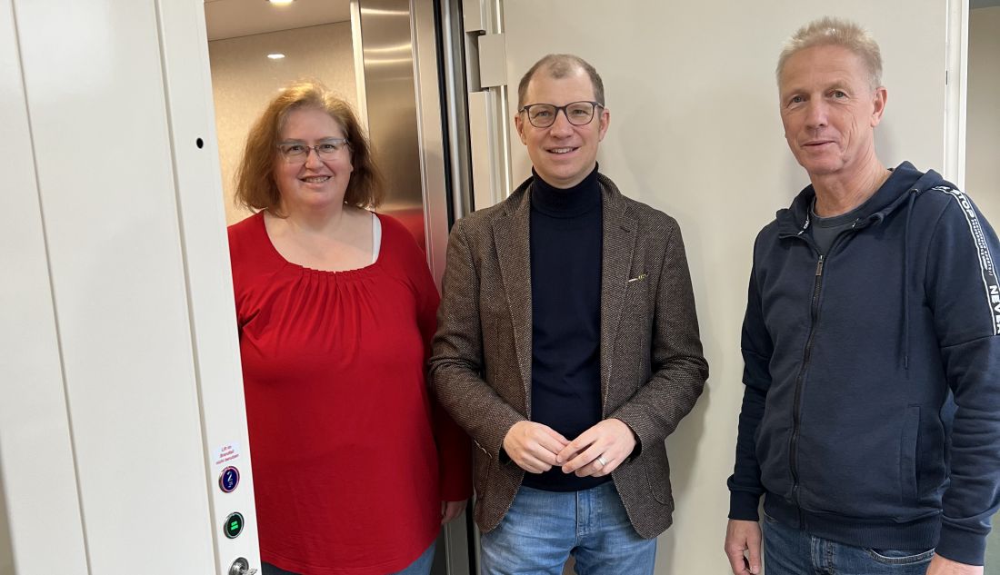 An der Hammerwaldschule, einer Förderschule mit Förderschwerpunkt geistige Entwicklung, wurde kürzlich ein neuer Aufzug in Betrieb genommen. Hierfür wurde der alte Bestandsaufzug entfernt und durch einen größeren, hydraulischen Aufzug mit einem Kabineninnenmaß von 1,10 auf 1,40 Meter ersetzt. Landrat Jan Weckler freut sich, dass damit nun ein barrierefreier Zugang zu den Obergeschossen und damit unter anderem zur Bibliothek und zum Computerraum im zweiten Obergeschoss besteht: „Der neue Aufzug bietet Platz für eine Rollstuhlfahrerin oder einen Rollstuhlfahrer und eine Begleitperson", erläutert der Landrat. Die Kosten für die Baumaßnahme beliefen sich auf rund 230.000 Euro, teilweise gefördert durch das Kommunalinvestitionsprogramm (KIP).