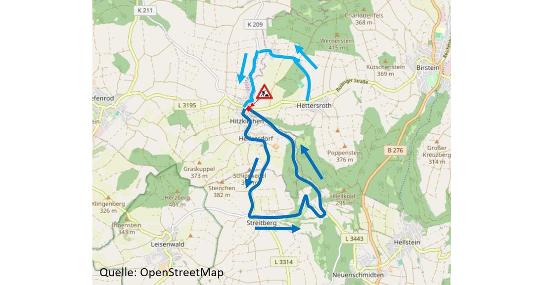 Verkehrsteilnehmende von Kefenrod kommend werden in Richtung Birstein über Helfersdorf und Streitberg nach Hettersroth geführt. Aus Richtung Birstein erfolgt die Umleitung ab Hettersroth  über die K 921 (Höfen) und die K 209 zur L 3195 bei Hitzkirchen. Sofern die Arbeiten planmäßig durchgeführt werden können, ist das Bauende bis Anfang Dezember 2025 anvisiert.