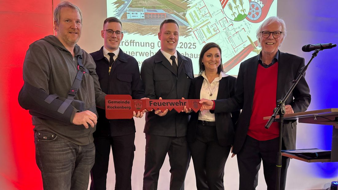 Die Eröffnung des neuen Feuerwehrhauses der Feuerwehren der Gemeinde Rockenberg ähnelte einem Volksfest. Alle Plätze waren restlos besetzt. Hier zu sehen: Die Schlüsselübergabe des Architekturbüros an die Verantwortlichen der Gemeinde und Feuerwehr. V. l. n. r.: Christian Möller (Architekturbüro Möller), David Stary (Stellvertretender Gemeindebrandinspektor), Thomas Ulowetz (Gemeindebrandinspektor), Olga Schneider (Bürgermeisterin Rockenberg), Alfred Möller (Architekturbüro Möller). Foto: Gemeinde Rockenberg