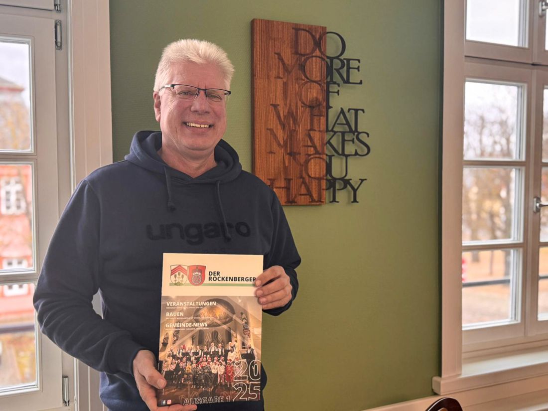 Wolfgang Triebert aus dem Rockenberger Rathaus-Team (Bauhofleiter) hält die neue Ausgabe des „Rockenbergers“ in den Händen. Die neue Ausgabe des beliebten Gemeinde-Magazins liegt ab jetzt unter anderem im Rathaus zur kostenfreien Abholung bereit.