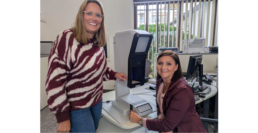 Katja Weil (links) vom Bürgerbüro Rockenberg und Rockenbergs Bürgermeisterin Olga Schneider (rechts) präsentieren das Fototerminal zur Umsetzung der digitalen Passfotos für Ausweisdokumente.