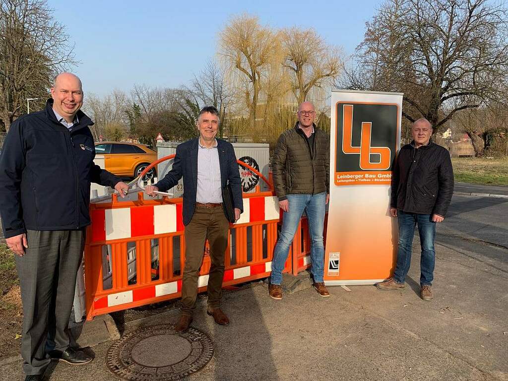 Foto: Kreisbeigeordneter Matthias Walther und Niddas Bürgermeister Hans-Peter Seum informieren sich bei Projektleiter Christoph Schulz und Firmenchef Siegfried Leinberger und von der Leinberger-Bau GmbH über den Stand der Verkabelungsarbeiten.