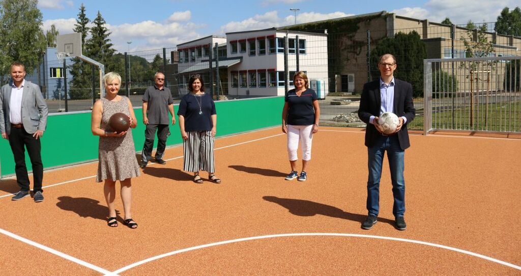 Im Rahmen der Umgestaltung des Schulhofs am Gymnasium in Nidda wurden ein Kleinspielfeld für Fußball und Basketball eingerichtet. „Damit“, so Landrat und Schuldezernent Jan Weckler, „soll den Schülerinnen und Schülern ein differenziertes Angebot an unterschiedlichen Aktivitäten in den Pausenzeiten, aber auch ergänzend für den Sportunterricht und den Ganztag angeboten werden.“