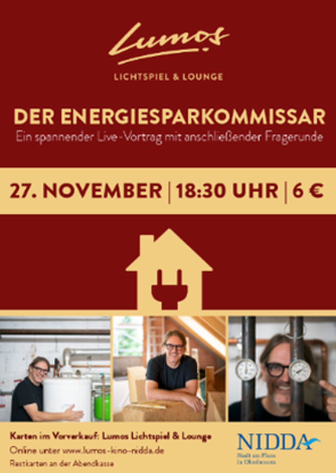 Auf Einladung der Stadt Nidda und in Kooperation mit dem Kino erwartet Sie ein unterhaltsamer Abend, der Wissen vermittelt, ohne trocken zu sein – und der zeigt, wie schon kleine Veränderungen im Alltag große Wirkung entfalten können. Niddas Bürgermeister Thorsten Eberhard freut sich, den Energiesparkommissar in Nidda begrüßen zu dürfen „Mit jeder sanierten Fassade und jedem sanierten Fenster investieren wir nicht nur in unsere Häuser, sondern auch in die Zukunft unserer Stadt. Gemeinsam mit dem Energiesparkommissar wollen wir zeigen, dass Energiesparen kein Verzicht ist, sondern ein Gewinn – für den Geldbeutel, unser Wohngefühl und das Klima“.