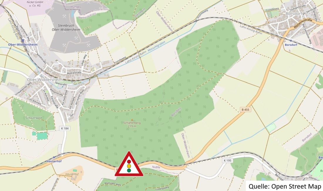 Wegen notwendiger Reparaturarbeiten an der Fahrbahn muss Hessen Mobil voraussichtlich von Montag, 18.11.2024, bis Dienstag, 19.11.2024, die Bundesstraße 455 zwischen Nidda/Ober -Widdersheim und Nidda/Borsdorf, bis zur Einmündung nach Nidda/Geiß-Nidda, abschnittsweise halbseitig sperren.