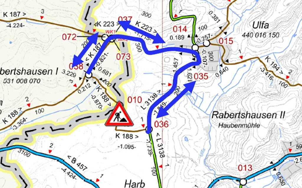 Bis aller Voraussicht nach zum 18.09.2020 werden die Verkehrsteilnehmer ab Rabertshausen über Ulfa zur L 3138 umgeleitet. Die Umleitung der Gegenrichtung erfolgt entsprechend.