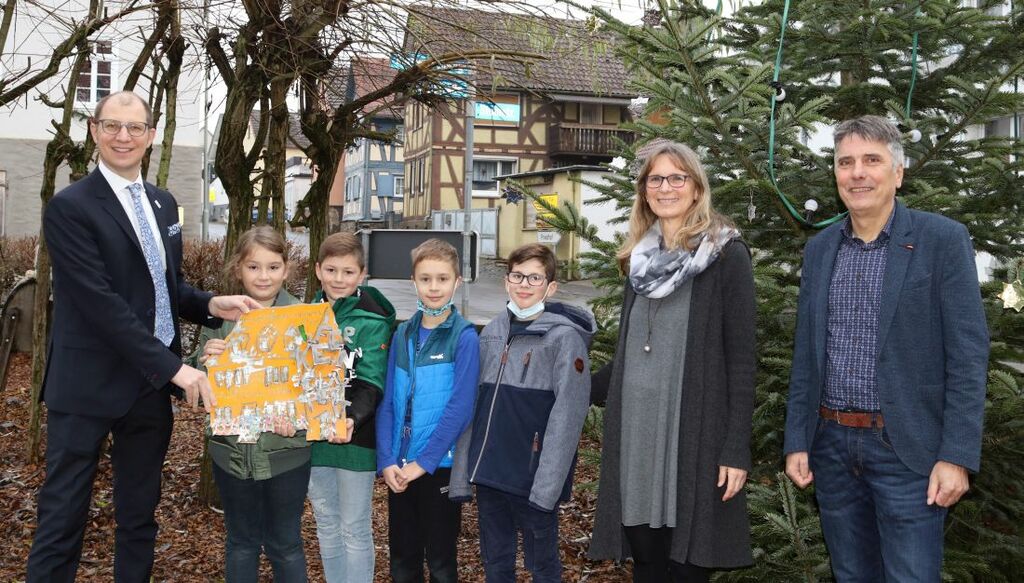 Foto (von links): Landrat Jan Weckler, Paul, Nika, Luka und Jonas mit Schulleiterin Gesine Haus und Bürgermeister Hans-Peter Seum.