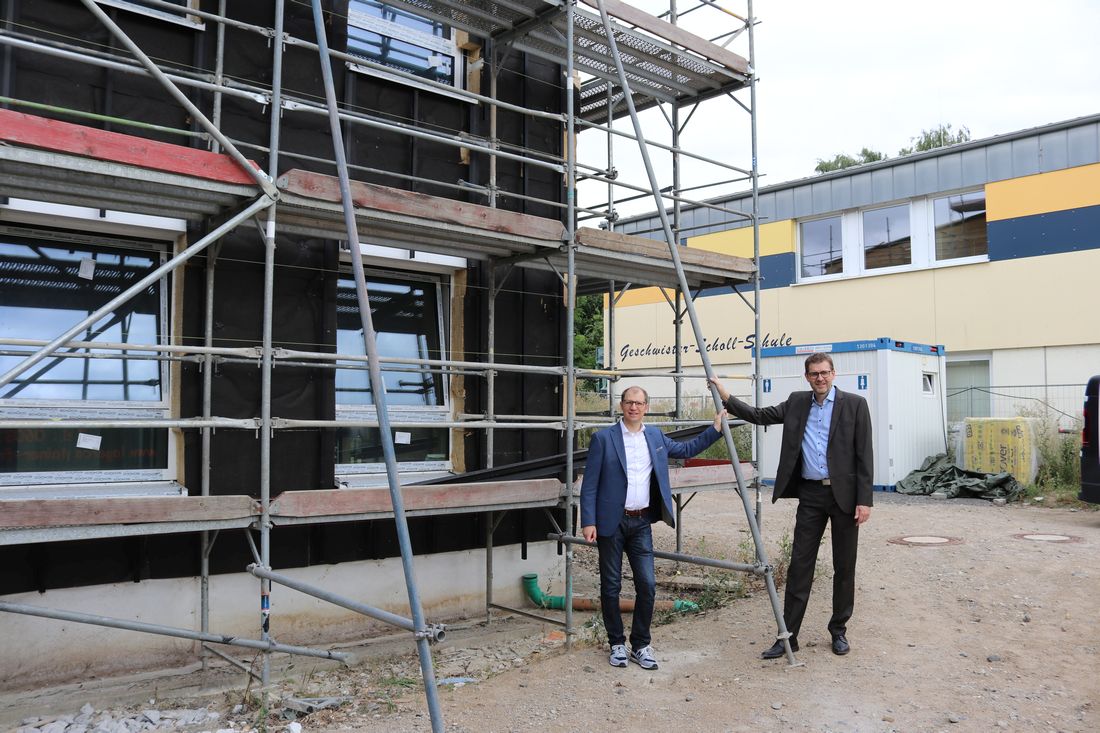 „Mit dem Anbau schafft der Wetteraukreis die Voraussetzungen für den Ausbau der Ganztagsbetreuung an der Geschwister-Scholl-Schule“, fasst Landrat Jan Weckler zusammen, der sich gemeinsam mit Stephan Zelewski, Fachstellenleiter Neubau und Sanierung des Wetteraukreises, ein Bild vom Baufortschritt machte. Allein in diese Maßnahme investiert der Wetteraukreis mit Unterstützung des Landes Hessen rund drei Millionen Euro. „Die Erweiterung ist ein weiterer Baustein des größten Schulbauinvestitions- und Sanierungsprogramms in der Geschichte des Wetteraukreises. Die Arbeiten gehen erfreulicherweise bisher gut voran – und das, obwohl die Situation im Baugewerbe aktuell schwierig ist.“